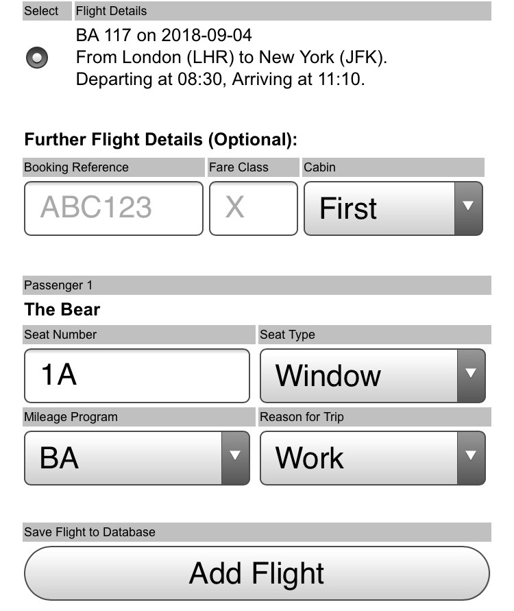 | When a flight number is used for more than one flight (such as the BA15 from London to Sydney - which is actually two flights, one from London to Singapore and another one from Singapore to Sydney) you'll be asked which one you want to add. You can then add your booking details, such as seat number, cabin, or booking reference. trip47.org allows you to set up default values - so if you commute twice a week in seat 9A, you'll only need to enter that once. |