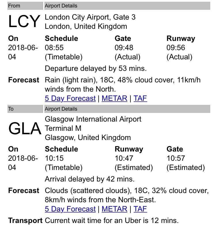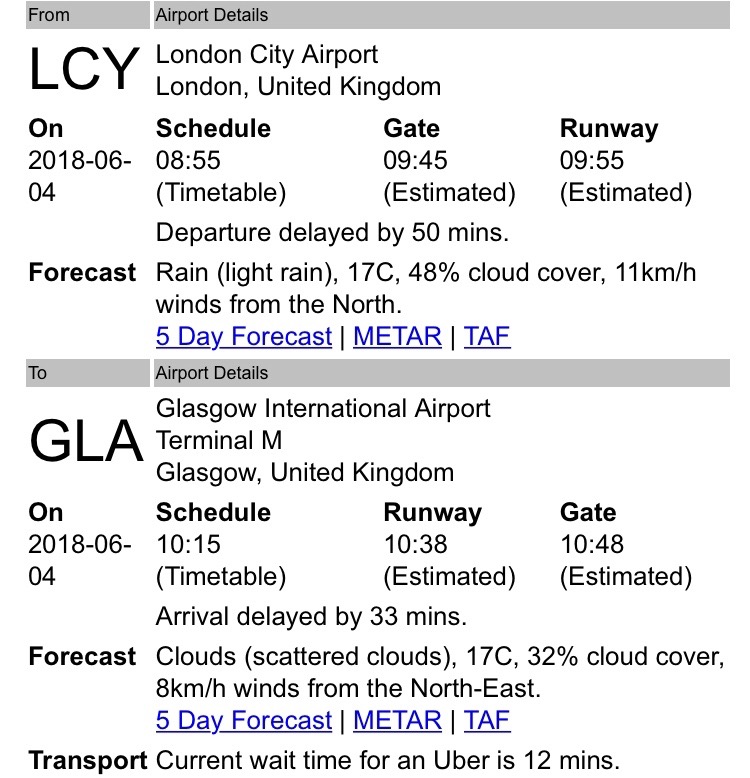 | From 24 hours before departure, trip47.org starts providing you with live flight information, such as departure delays, new estimated times, weather forecasts for the time of your departure & arrival. It will also give you information on the aircraft operating your flight and if it is already on it's way to you. It even shows you if Uber operates at your destination - and how long you have to wait for one. |