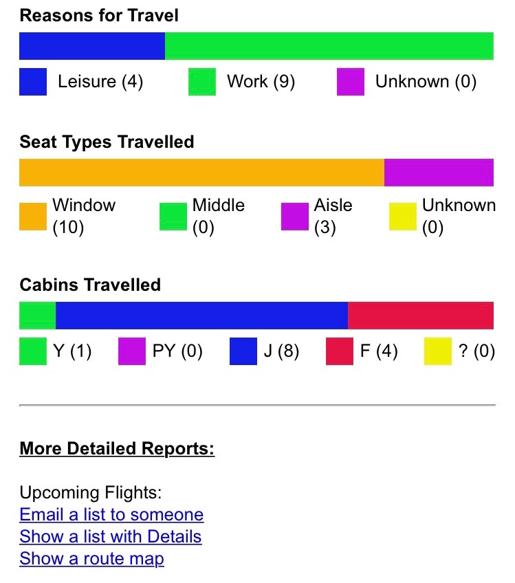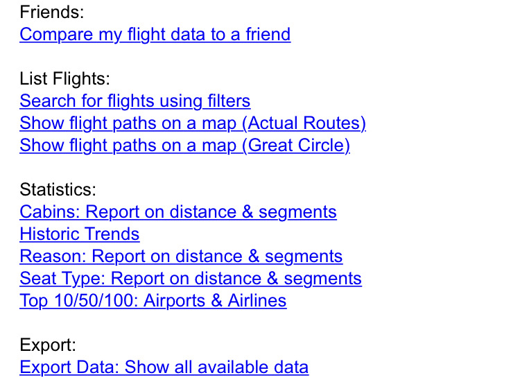 | Want to have more insight into your flight data? Use ready made reports, allowing you to see your flights on a map, statistics, compare your flight data with friends, email your upcoming flights to someone, or even export data so you can do your own thing in Excel. |